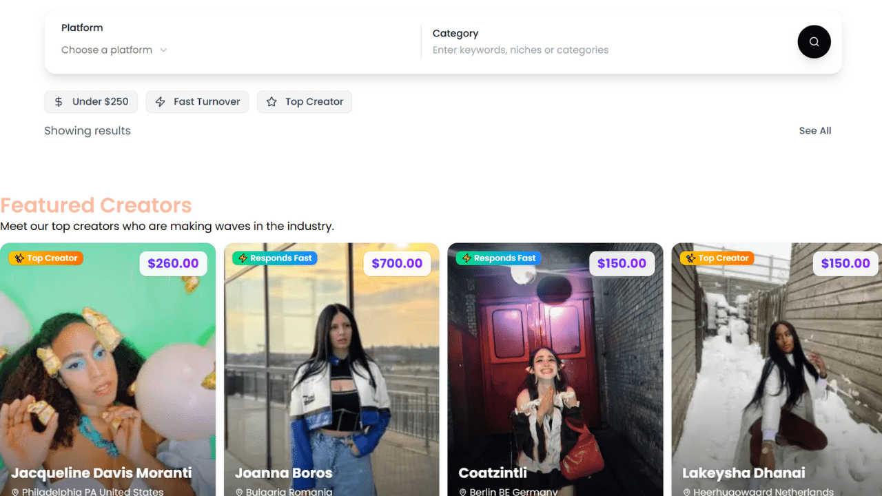 Browse and hire verified Instagram, TikTok, YouTube influencers in seconds