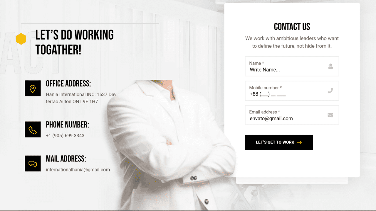 “Let’s Work Together” CTA for inquiries.